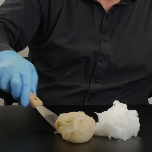 The part A is a white soft gel, while part B is a creamy yellow gel.