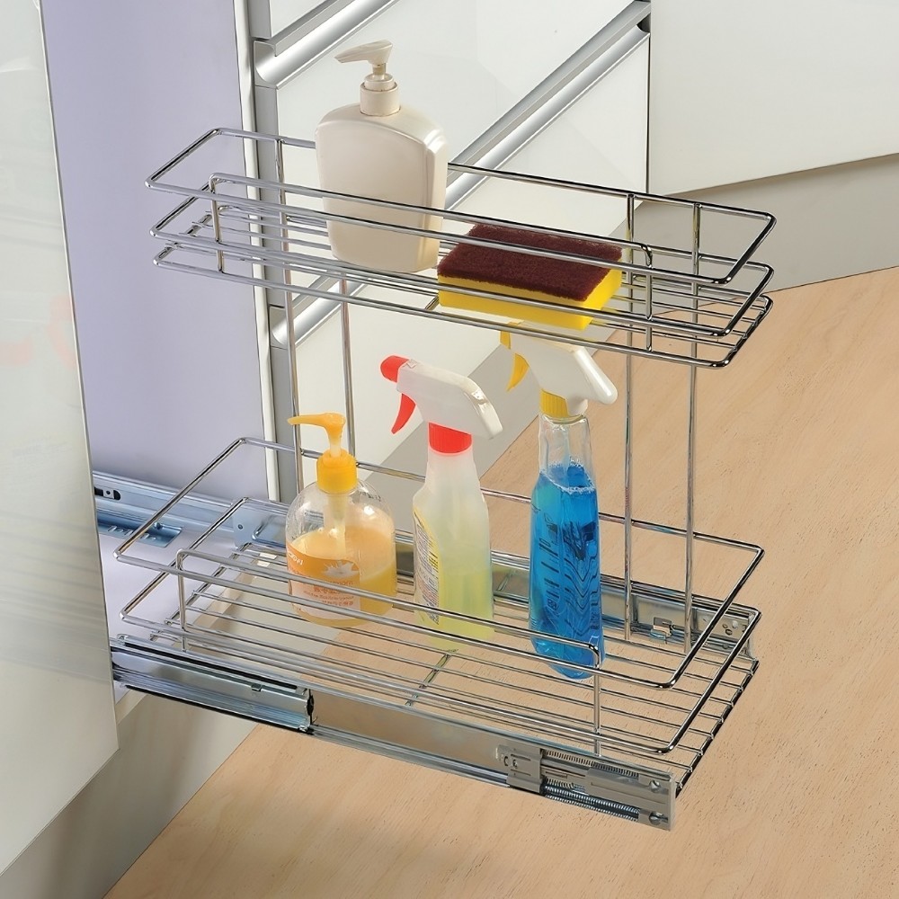 A narrow 2 tier chrome cleaning basket on pull-out bottom mounted rollers for bottom mounting to cupboard floors. It has a narrow offset design to fit in tight under sink spaces. This unit comes with full extension ball bearing slides for bottom mounting and heavy gauge chrome plated steel baskets