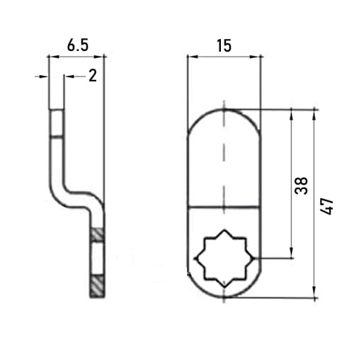 A flat or bent metal piece that attaches to the back of a cam lock cylinder. It is used instead of a straight bar when the lock's mounting position and the locking surface are on different planes, requiring a step or bend to reach the latching point.