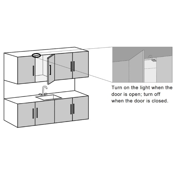 Operation: This sensor features the ability to switch the lighting on and off by sensing an object (door) in front of it. When the sensor is covered, the lights are off, and when the object is removed the lights turn on.
